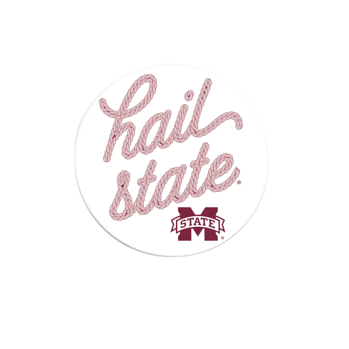 Show your playful spirit with the Howdy Hail State Button, featuring a charming cursive "Hail State" in a rope font. Perfect for adding a touch of fun and school pride to your outfit or accessories.