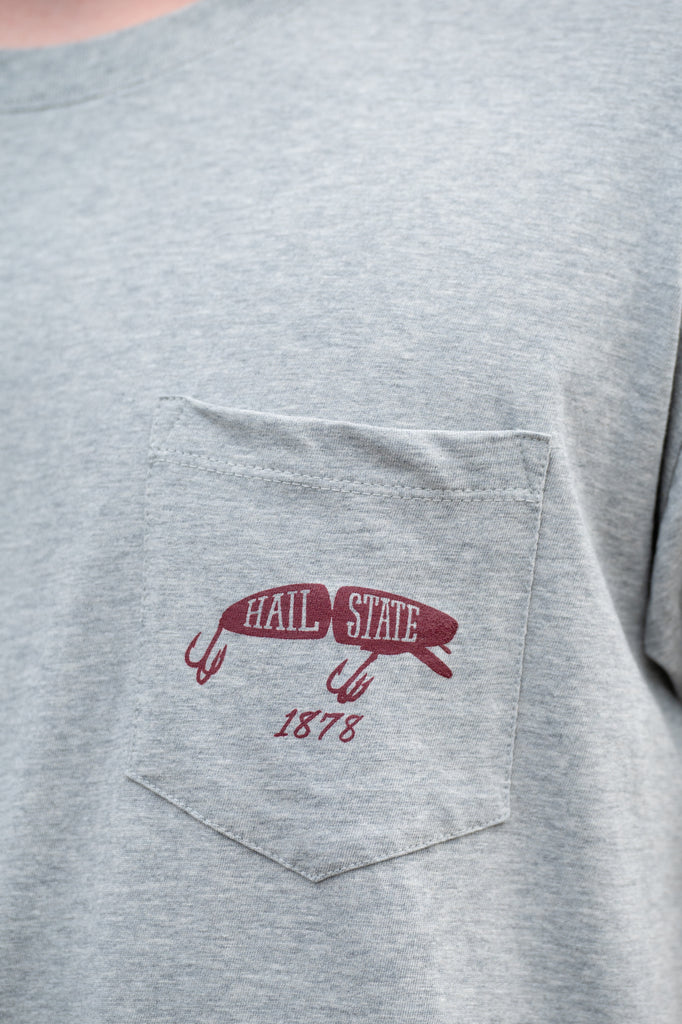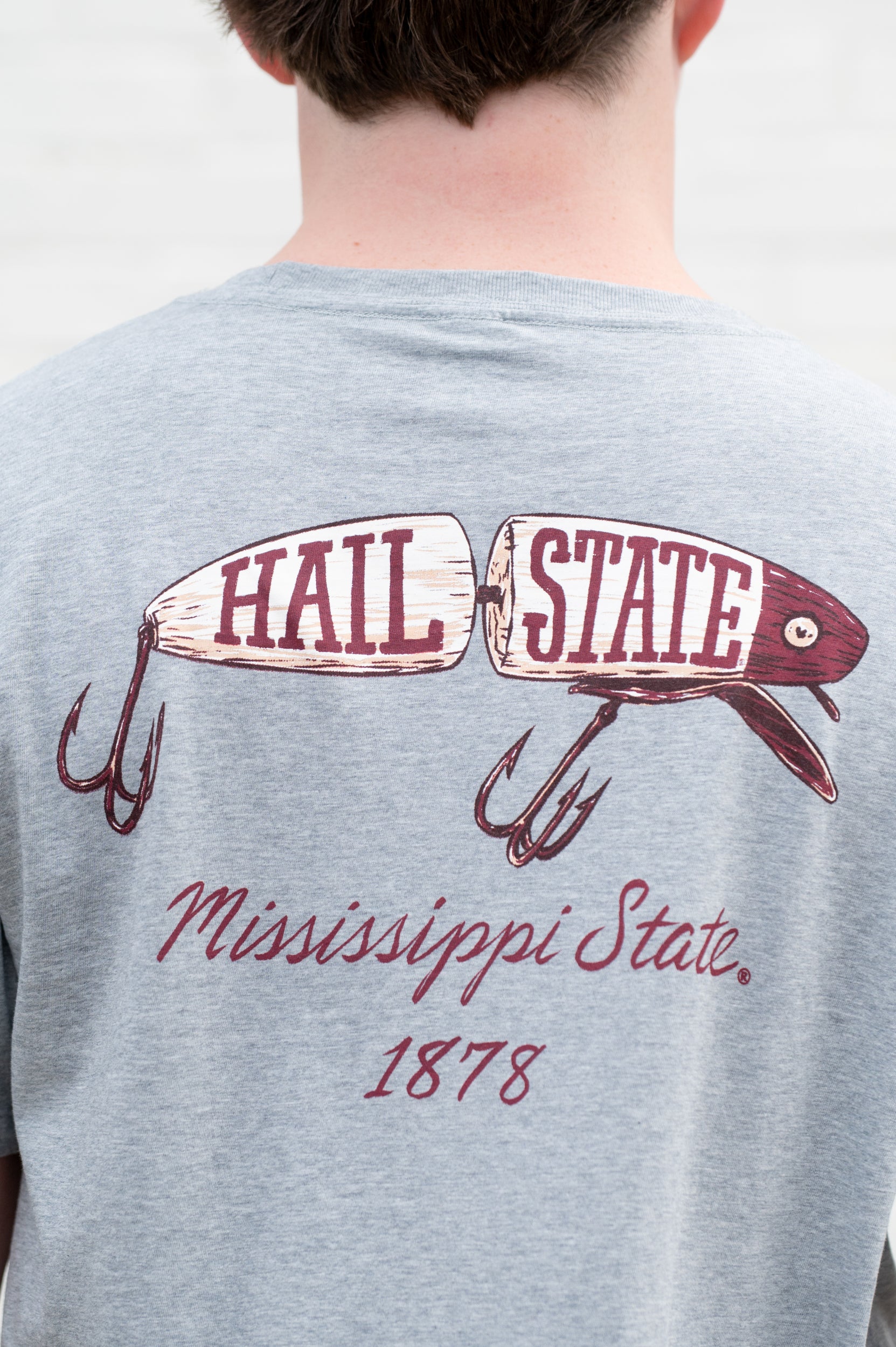 Celebrate your Mississippi State spirit with the Hail State Lure Tee. Featuring a unique hand-drawn design of Bully casting his reel from a bass boat adorned with State-themed decals, this shirt combines MSU pride with your love for fishing. Comfortable and eye-catching, it’s the perfect choice for your next trip to your honey hole or everyday wear.