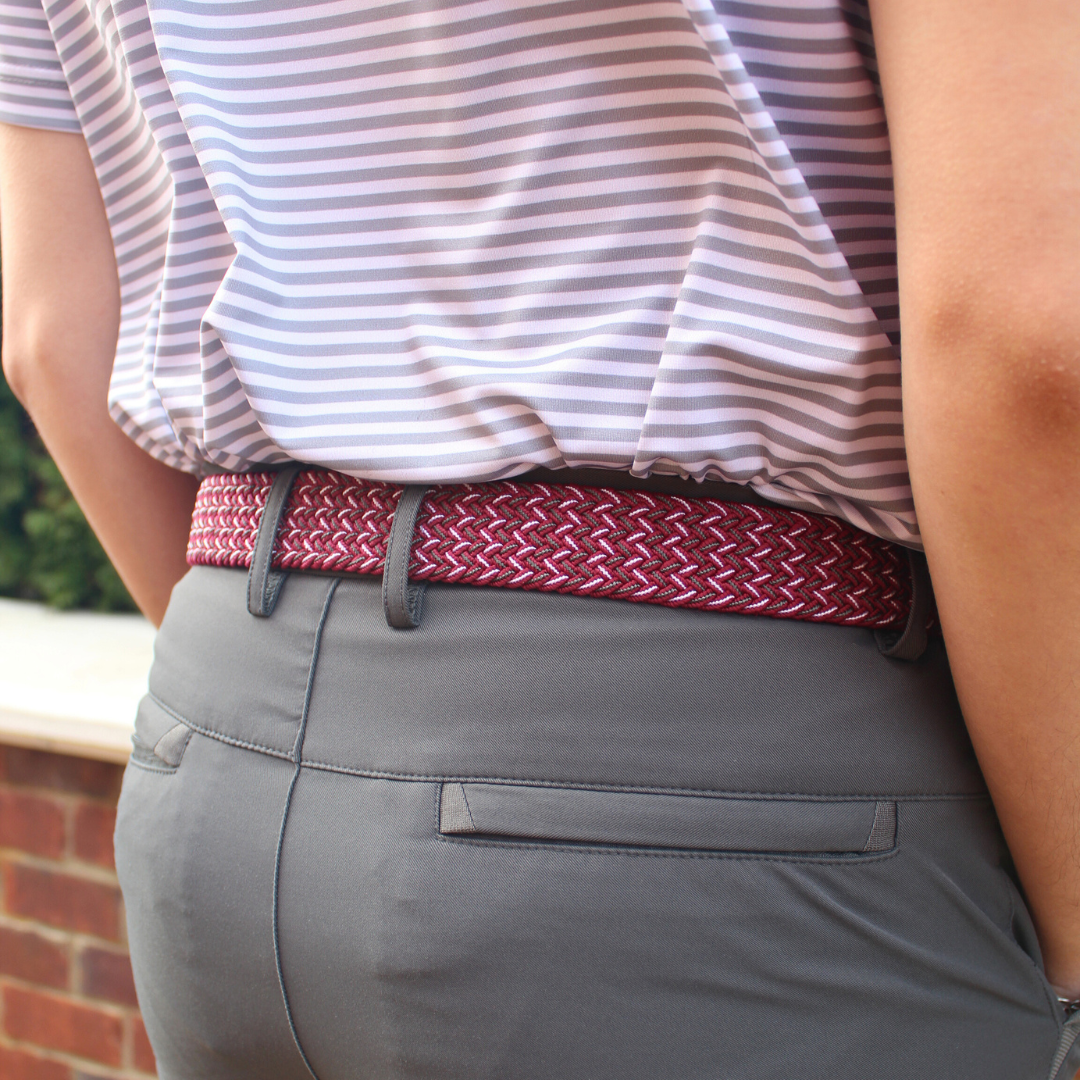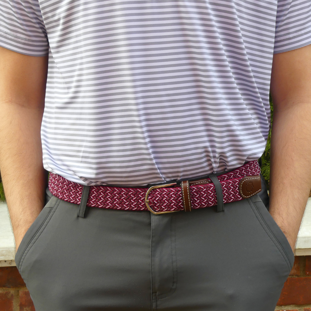 The Blackjack three-toned herringbone woven elastic-stretch belt. Maroon, Grey, and White belt with a rounded buckle and dark brown leather finish stamped with the Roostas logo. An adjustable clasp goes through the woven belt, allowing for adaptable sizing. Designed for comfort both on and off the course.