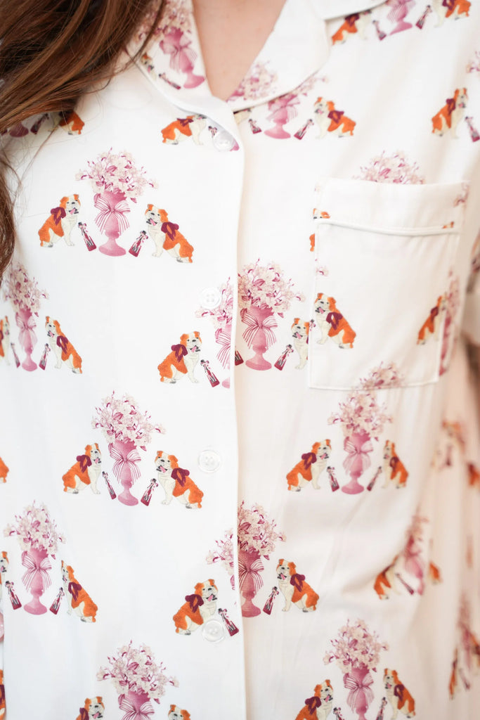The whimsical pattern showcases Mississippi State's beloved bulldogs in vibrant shades of maroon and white, beautifully contrasted against a backdrop of delicate floral blossoms. This nostalgic print pays homage to the rich Bulldog heritage and natural beauty that make Mississippi State University and this special college town so beloved.