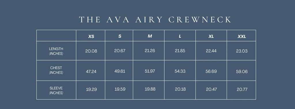 The Ava Airy material is THE softest. Lightweight and perfect for Fall! With a slight cropped fit, this crewneck fits true to size. Includes a woven label on the front center.