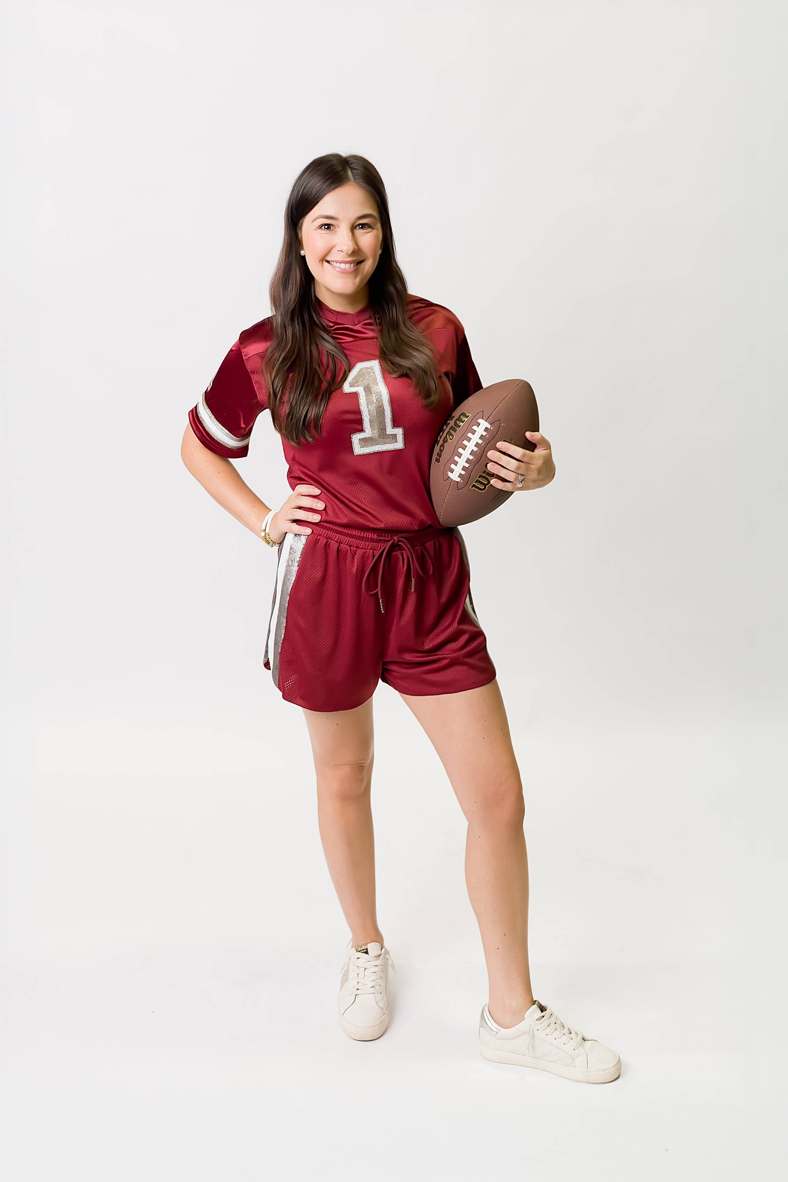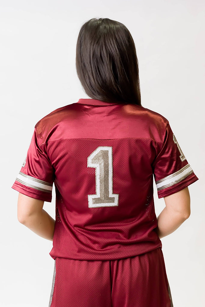 Bring fun and flair to your outfit with the Maroon and Silver Sequin Jersey. The sparkling silver sequins pop against the deep maroon fabric, creating a lively and festive look. Lightweight and comfortable, this jersey is perfect for dancing the night away or adding a playful twist to your everyday style.