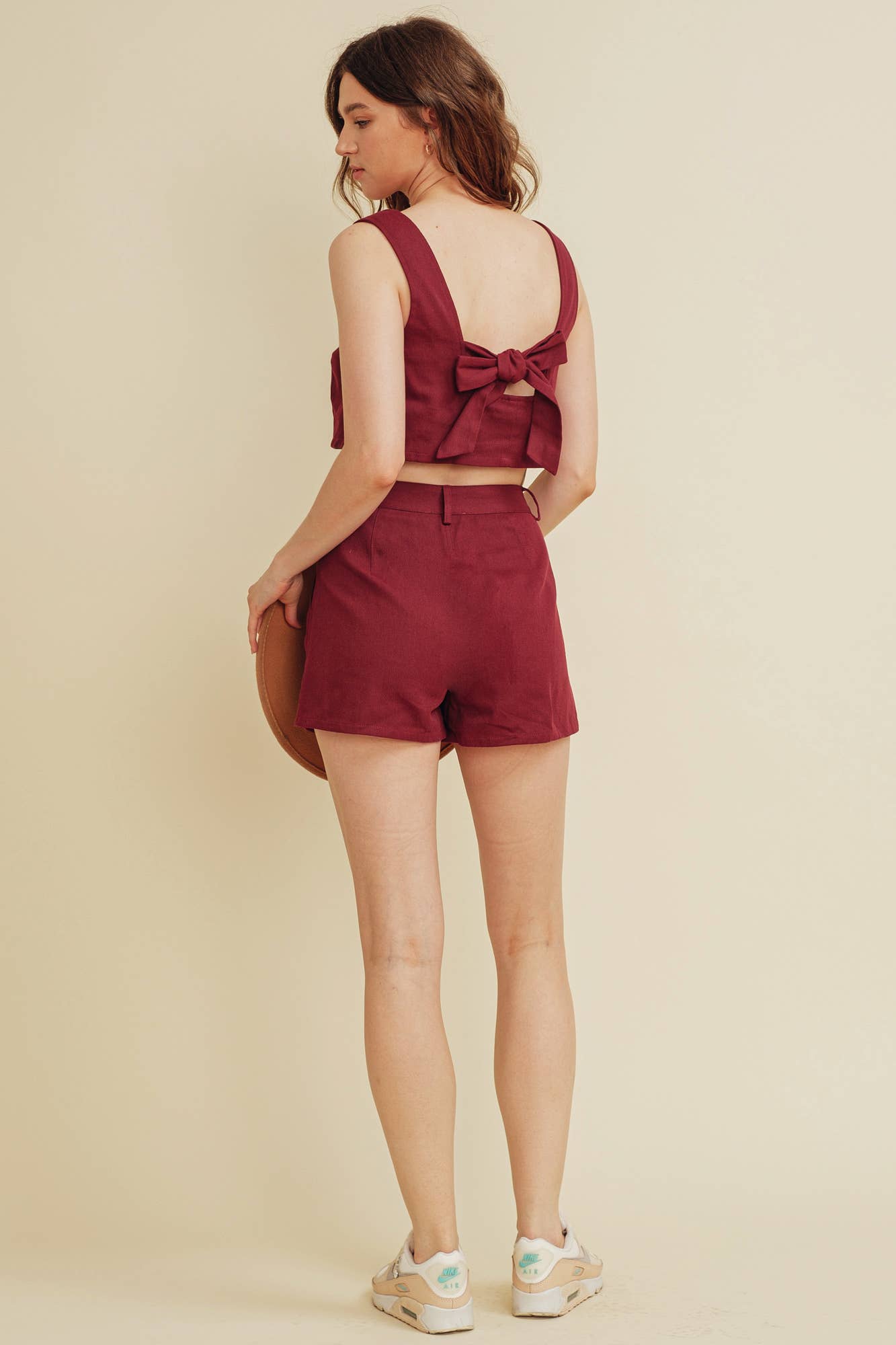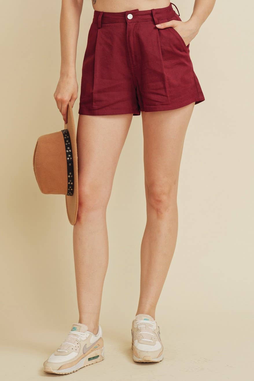 These maroon pleated front twill shorts bring a fun twist to your warm-weather wardrobe. Featuring a front button closure, they combine comfort with a touch of classic style. Perfect for your game day outfit!