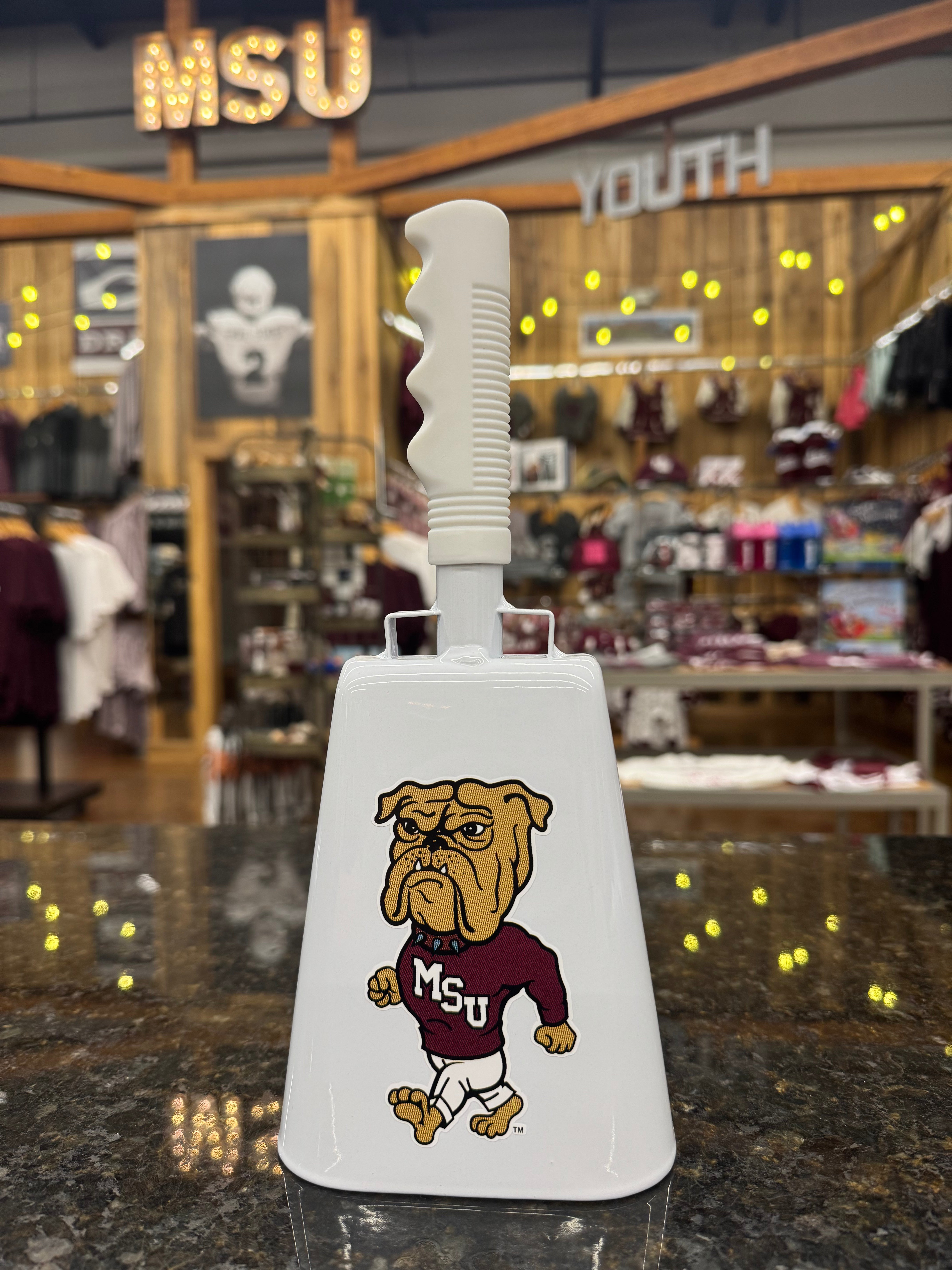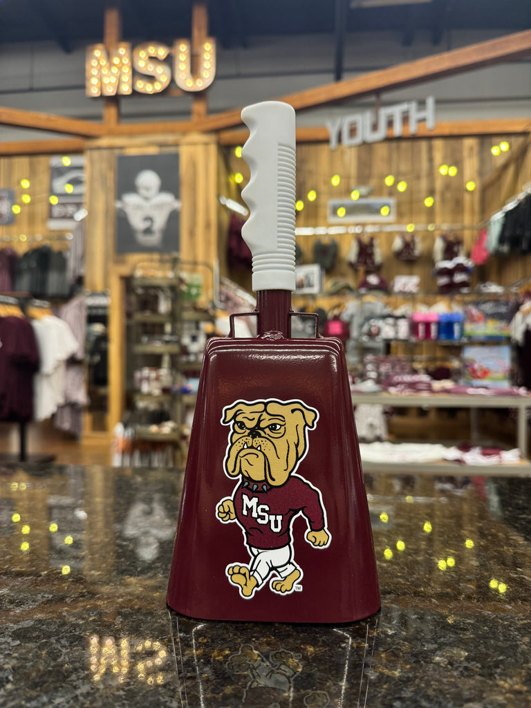 Ring True with this large-size 90's MSU Interlocking cowbell! Debuting the much loved 90's MSU logo, this bell stand 12" tall and comes in multiple colors. It's perfect for ringing at the game, dressing up a tailgate or party, or sitting on a desk – making it great gift to an alum, student or any Mississippi State fan. Hail State!