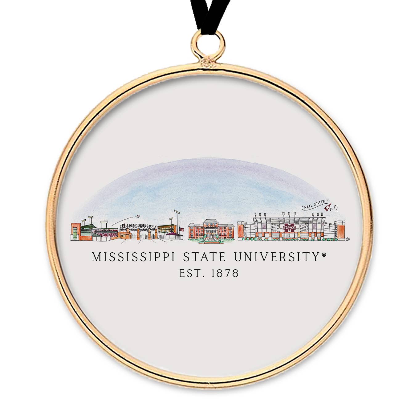 This 4" glass ornament with a brass frame features original skyline artwork of Mississippi State's classic campus landmarks. This piece is a classic addition to the holiday colleciton of any Mississippi State fan, student, or graduate.