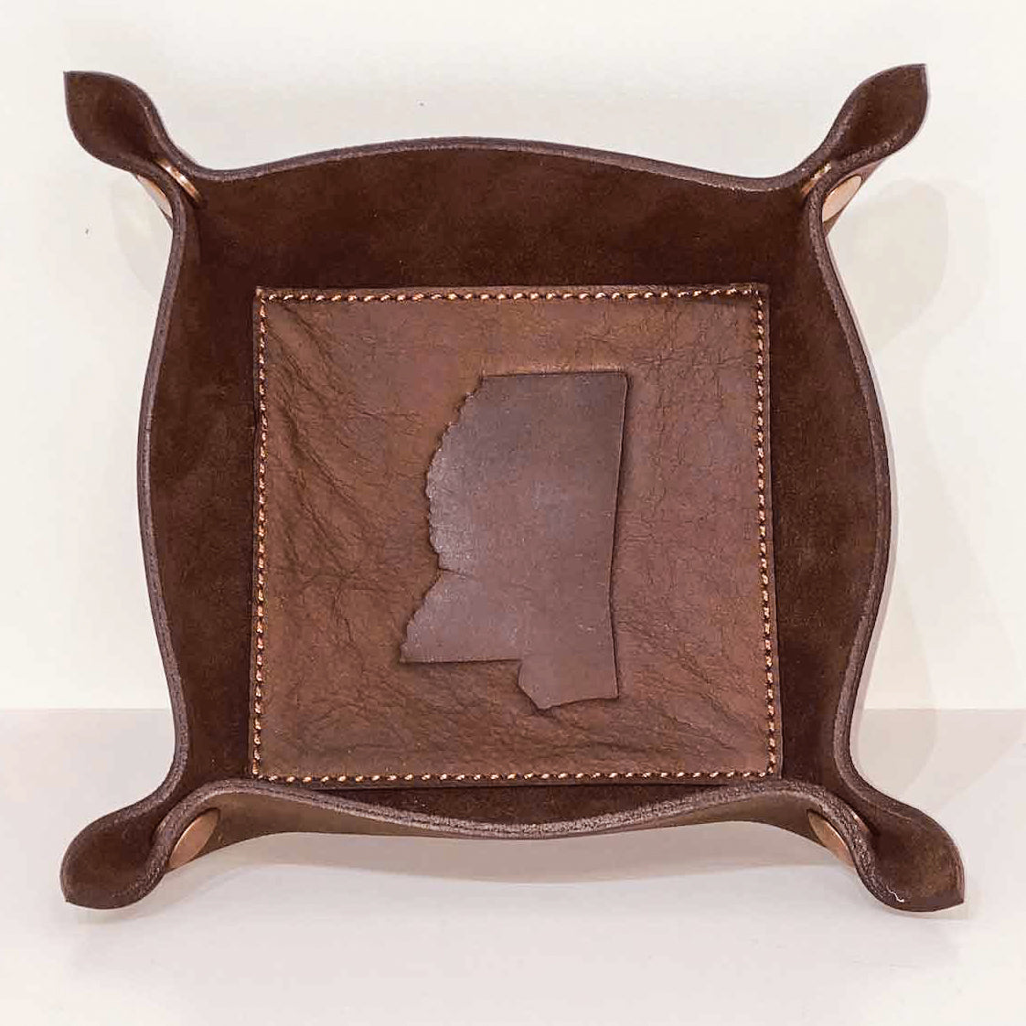 This Mississippi embossed 8" x 8" dark brown leather valet tray is a beautiful and unique way to show off the love of your home state! Crafted from genuine leather, this piece is a great subtle way to tidy up your home with the love of your state in mind.