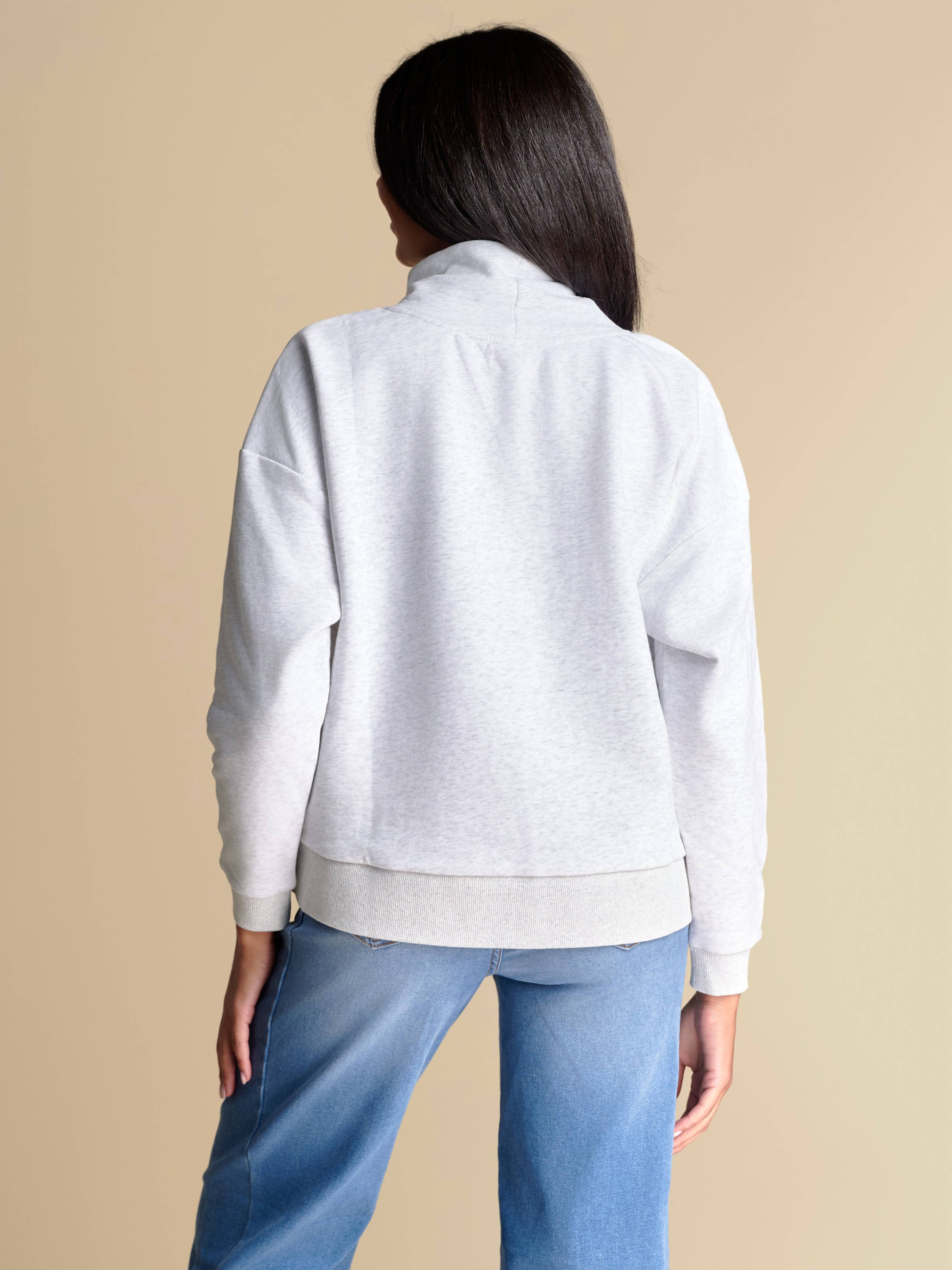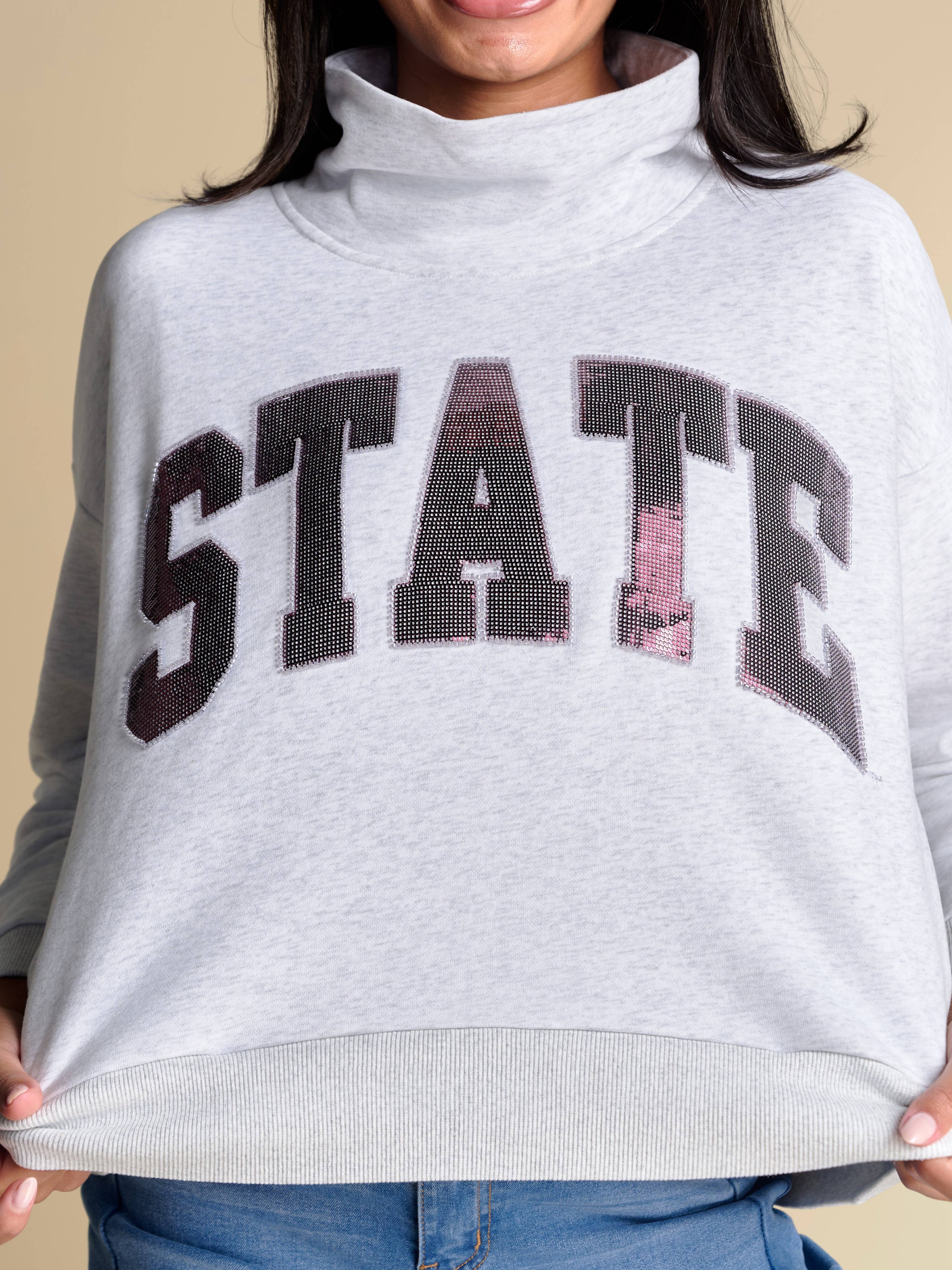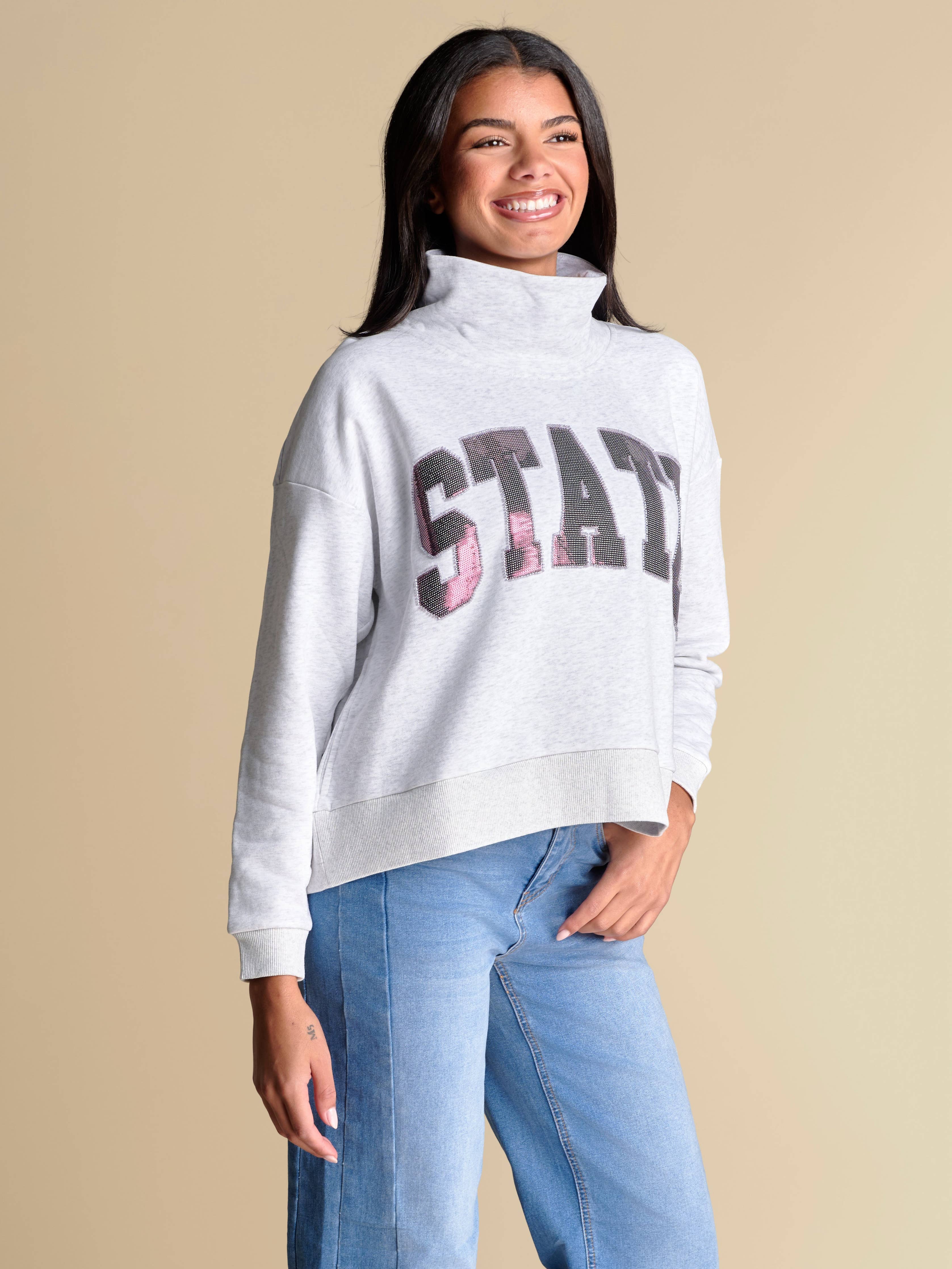 Details A sporty, casual silhouette with a touch of spirit. Designed with an oversized fit and hidden pockets at the side seams, this trendy mockneck sweatshirt is equal parts sporty and elevated. It blends everyday ease with playful details, featuring a sequin wordmark logo outlined in beading for just the right amount of shimmer. We’re styling this piece with a pair of colorful, printed jeans and sneakers for the ultimate game day statement look.