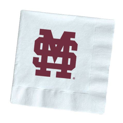 Featuring Mississippi State University Interlocking logo in maroon ink on a white beverage napkin