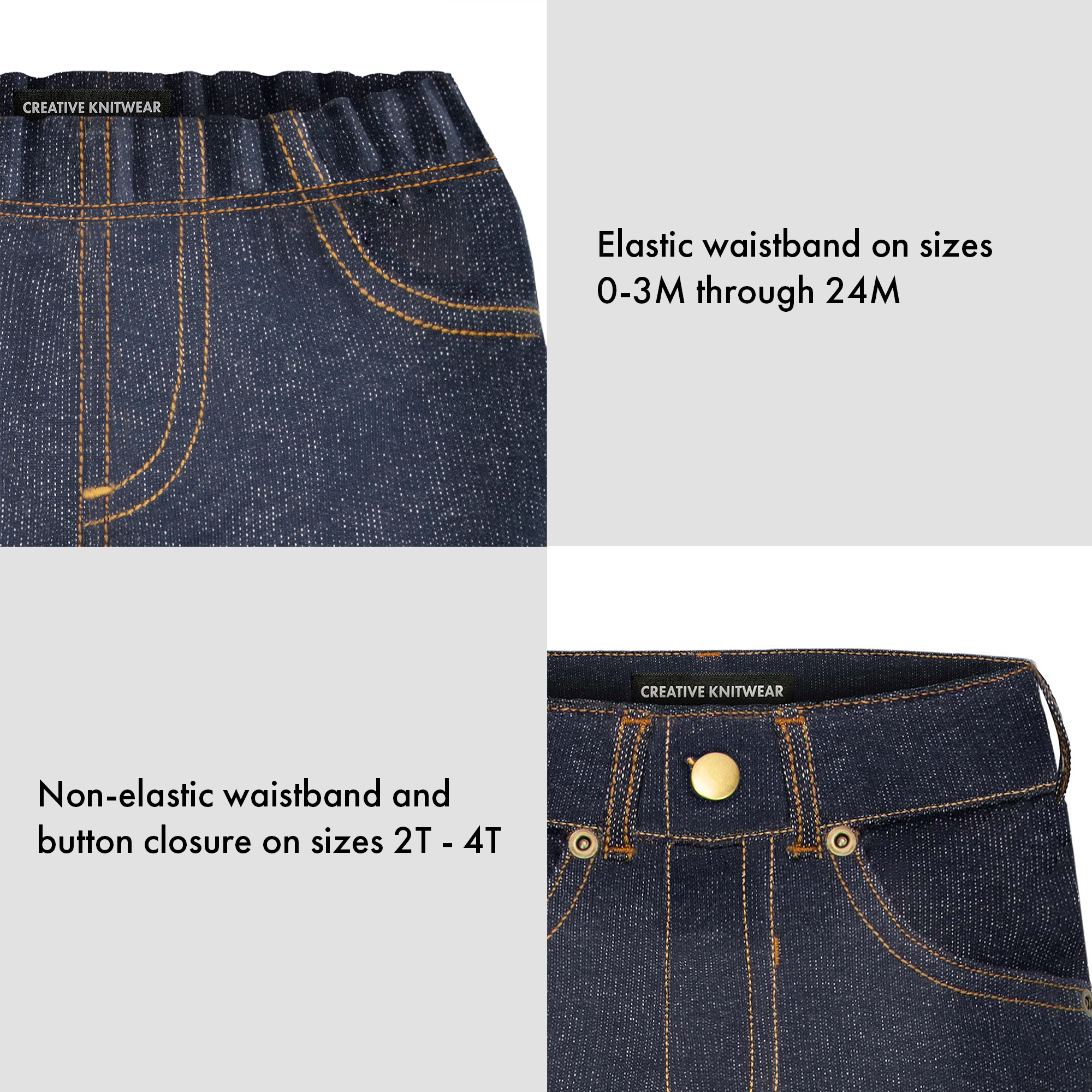 - Infant sizes( 0-24 Months) feature an elastic waistband for an easy pull up