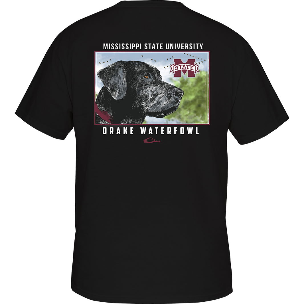 Man's best friend. Our cotton/poly blend tee has a black lab head scene on the back with Mississippi State University, logo and the words “Drake Waterfowl” with the Drake duck head logo below the graphic. The front of the tee proudly features M State on the chest pocket.