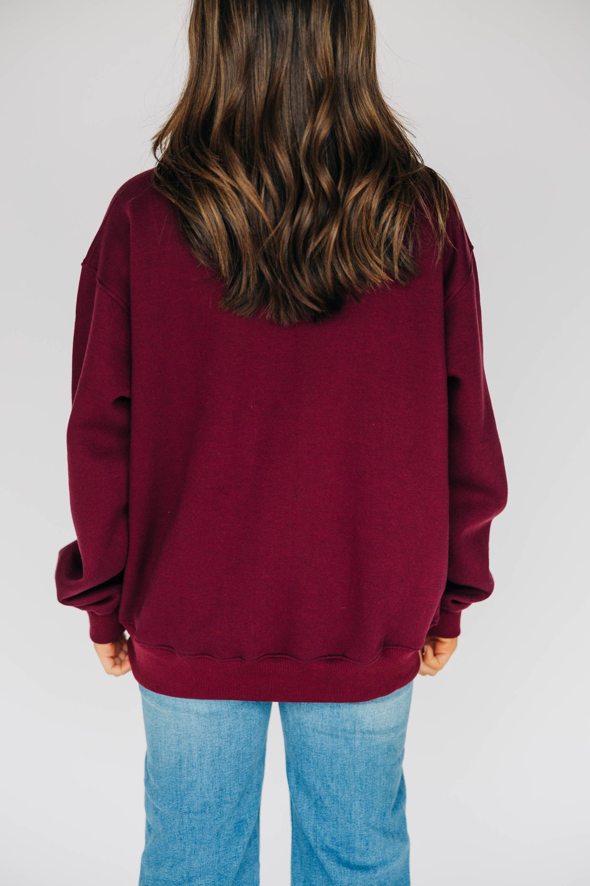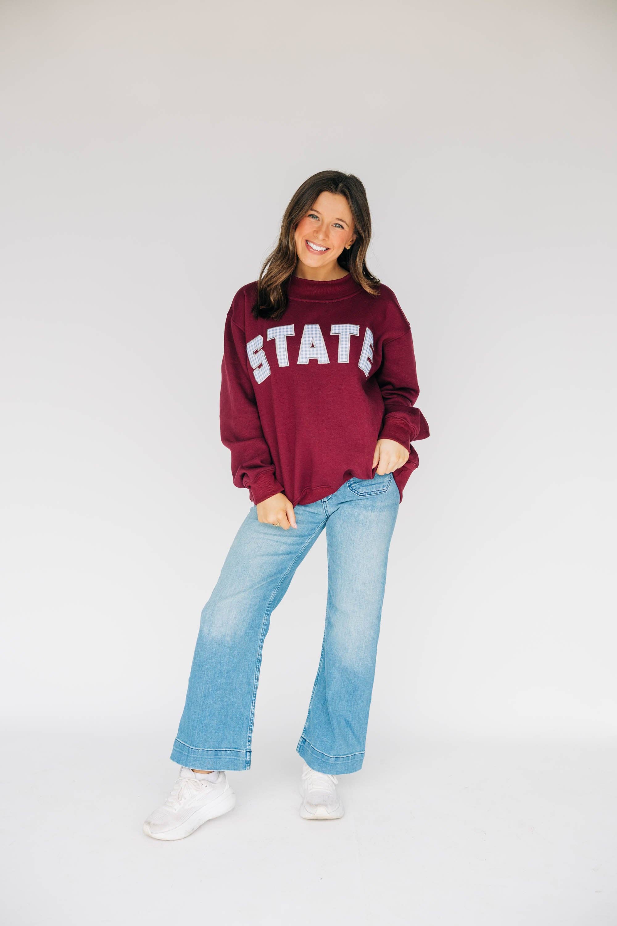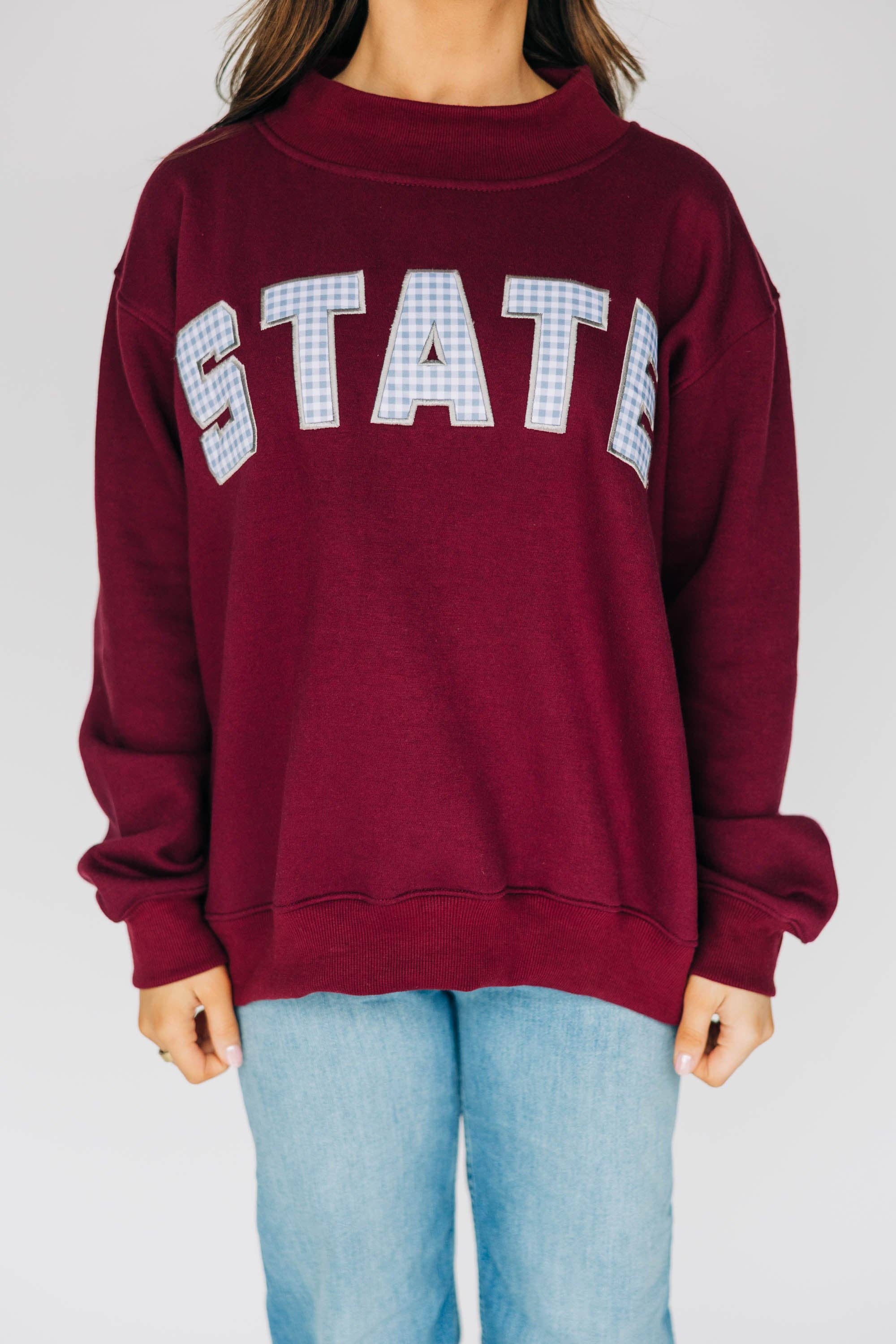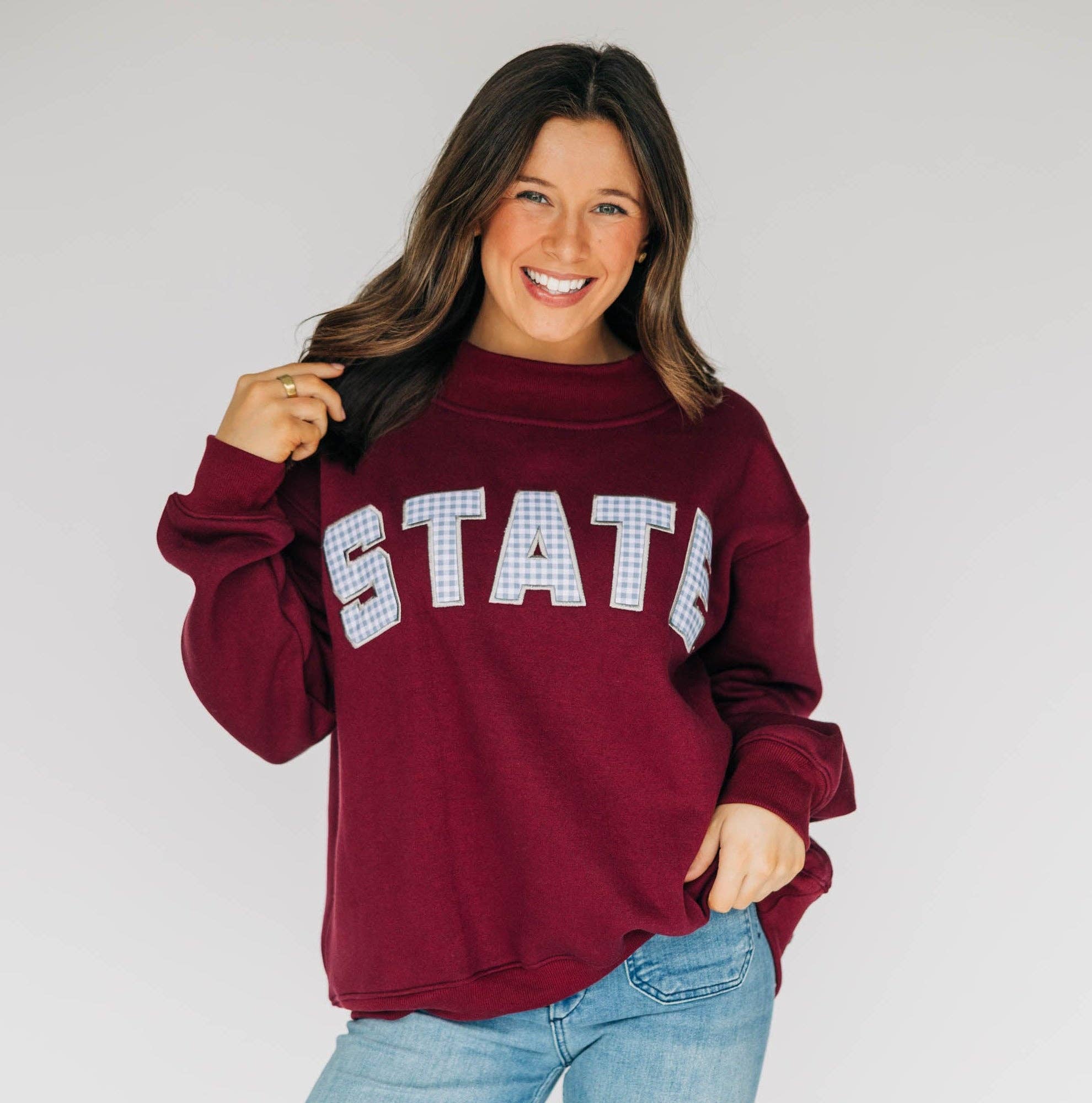 Say hello to your new favorite mockneck. The Mallory Gingham Mockneck features a high-quality appliqué arch with gingham fabric inside — the cutest way to rep your favorite school. It’s made from a thicker, midweight cotton-poly blend that feels soft, sturdy, and perfect for everyday wear. With a boxier fit than the Madi and a relaxed mock neckline, it’s flattering without trying. It fits true to size with a cuffed bottom, or you can size up for an extra-oversized, slouchy look.