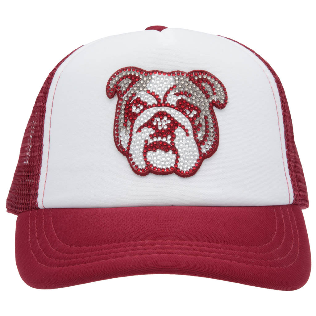 Add some sparkle to your style with the Youth Rhinestone Bulldog Trucker hat. Featuring a breathable maroon mesh back and an adjustable snapback closure, it offers a comfy fit for all-day wear. Perfect for young trendsetters who want to shine with a playful edge!